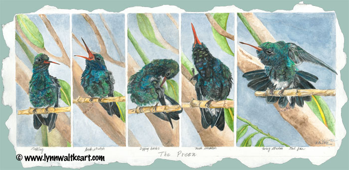 Broadbill hummingbird in five stages of preening